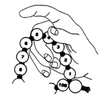 The japa mala is traditionally held in the right hand. Your index finger does not touch the mala. You begin with the first bead next to the head bead, and while gently rolling the bead back and forth between the thumb and middle finger of your right hand, you chant:
